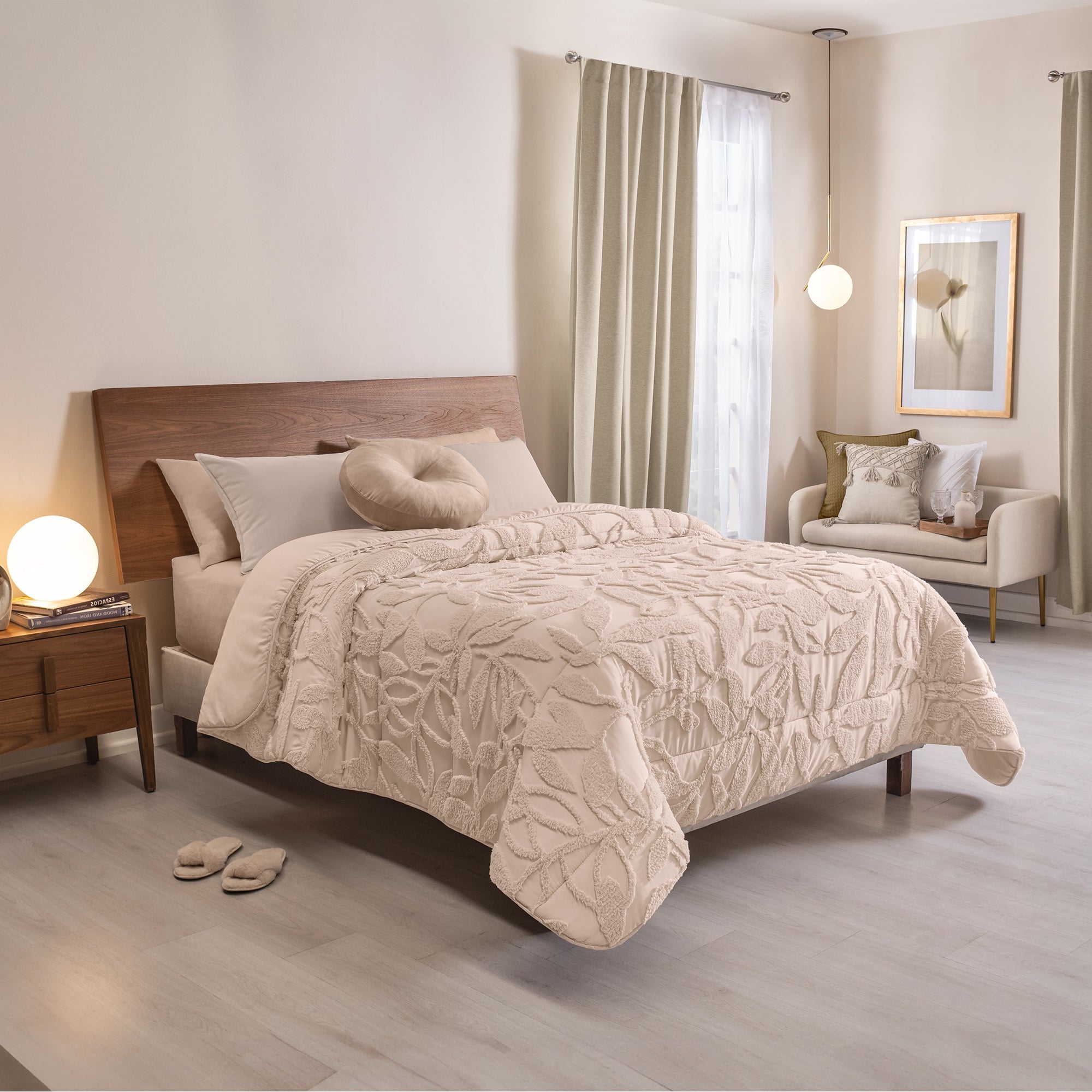 Juego de edredón con especialidad de textura. Suave por su textura viasoft. Incluye fundas estampadas y 2 cojines decorativos.