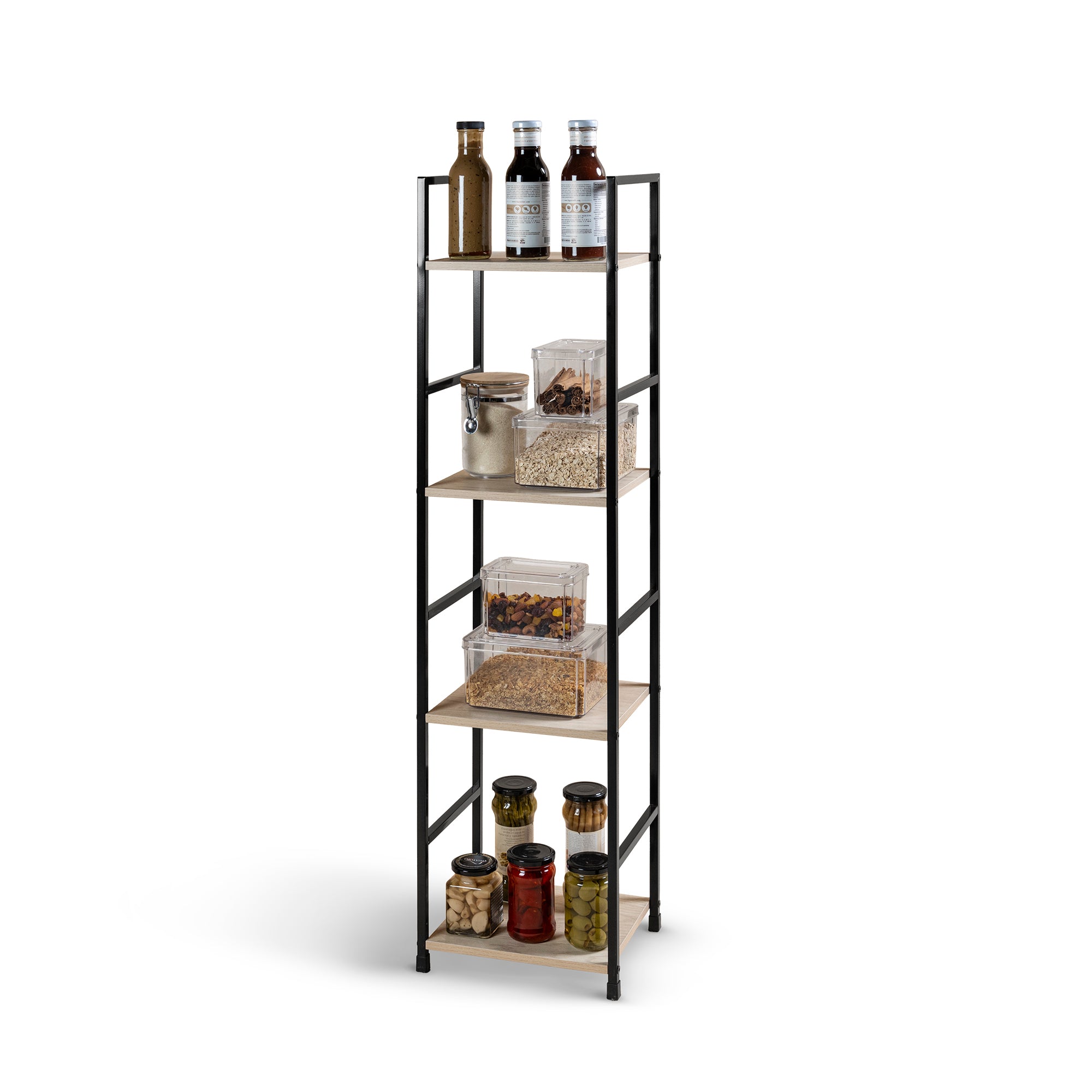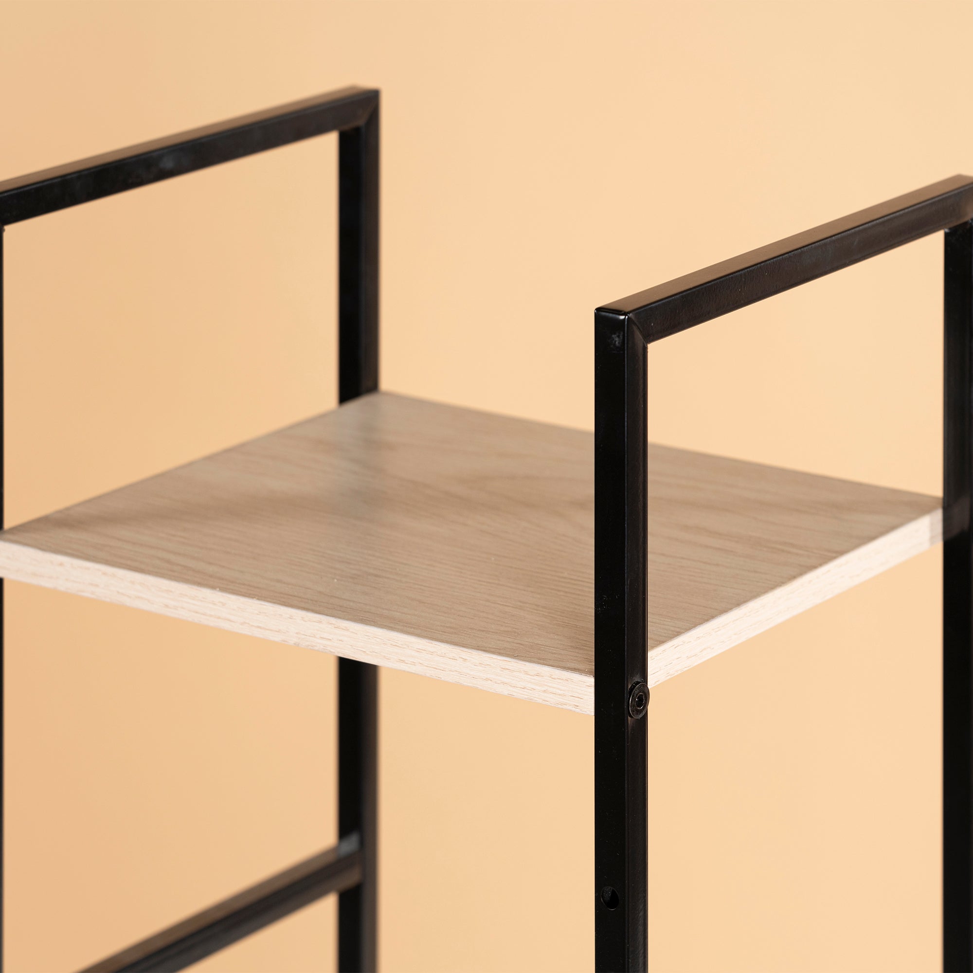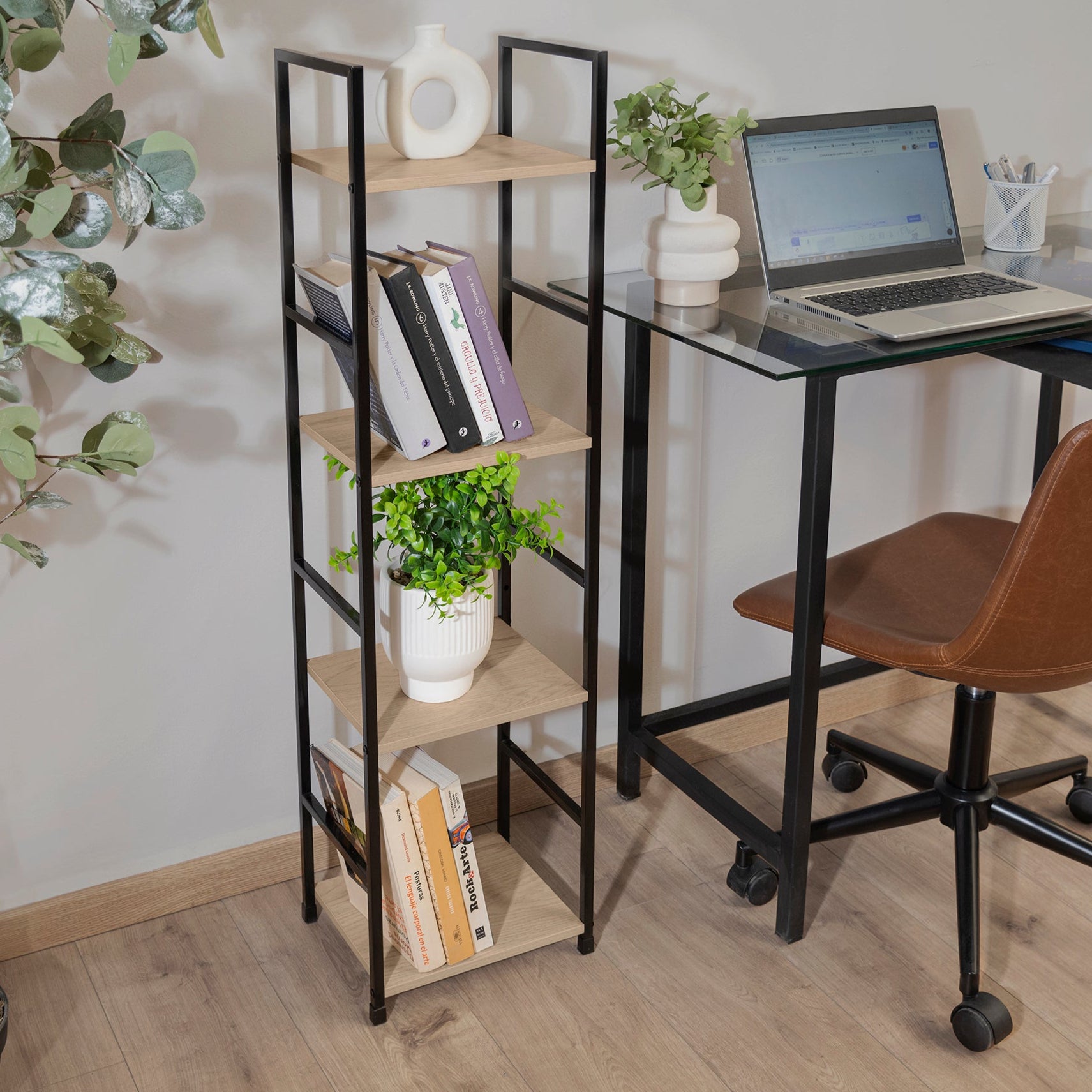 Librero de estilo industrial en color roble con estructura metálica, aportando un aire de modernidad y simplicidad