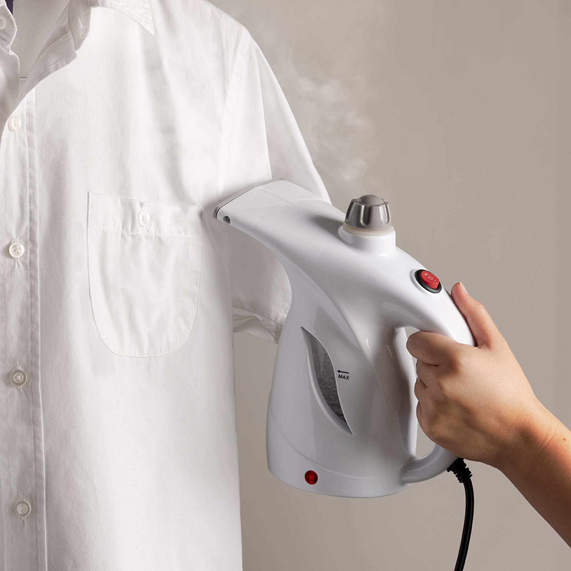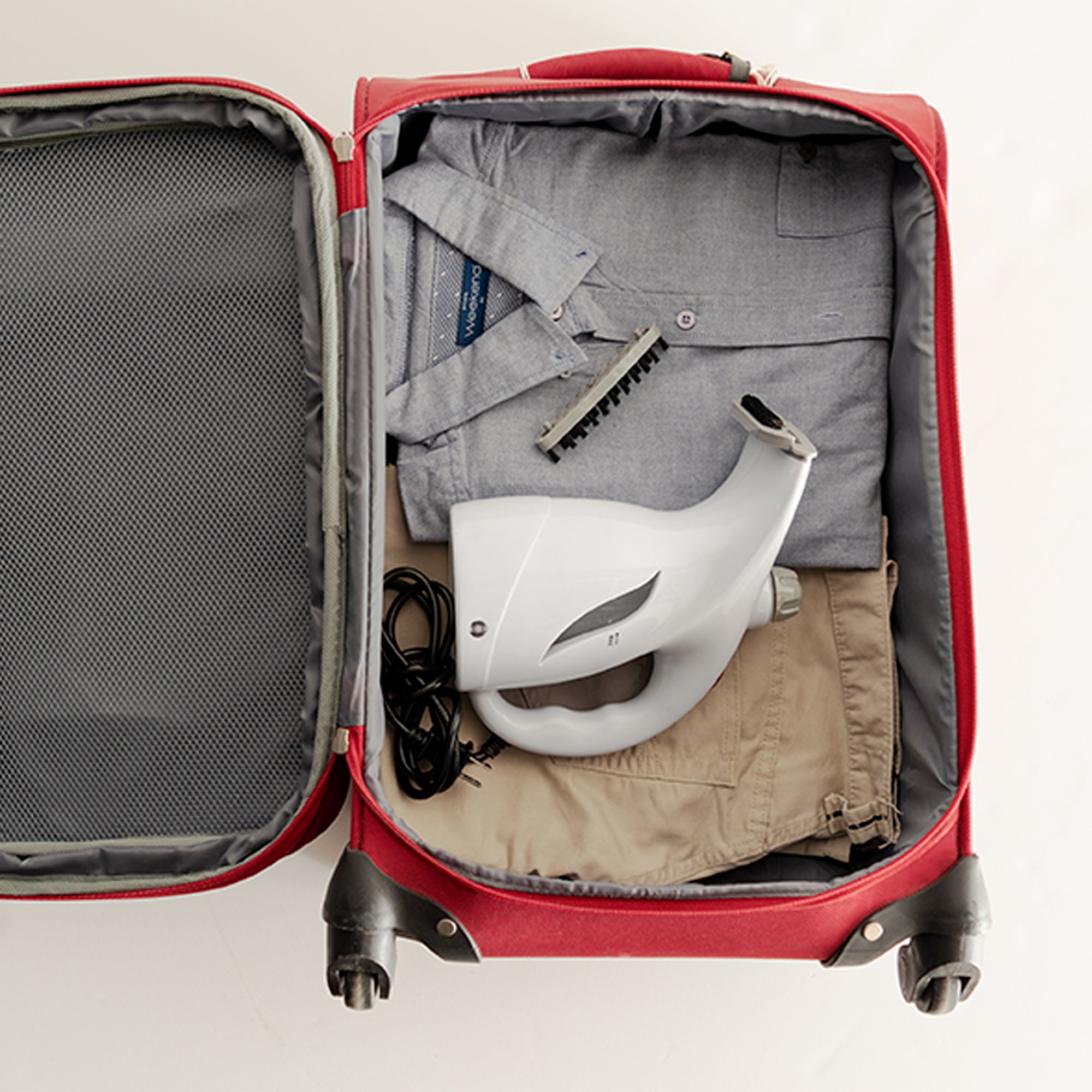 Plancha fácil con tu plancha de vapor portatil que contiene cepillo electrostático y cepillo para pelusa. Llévala a todos lados.