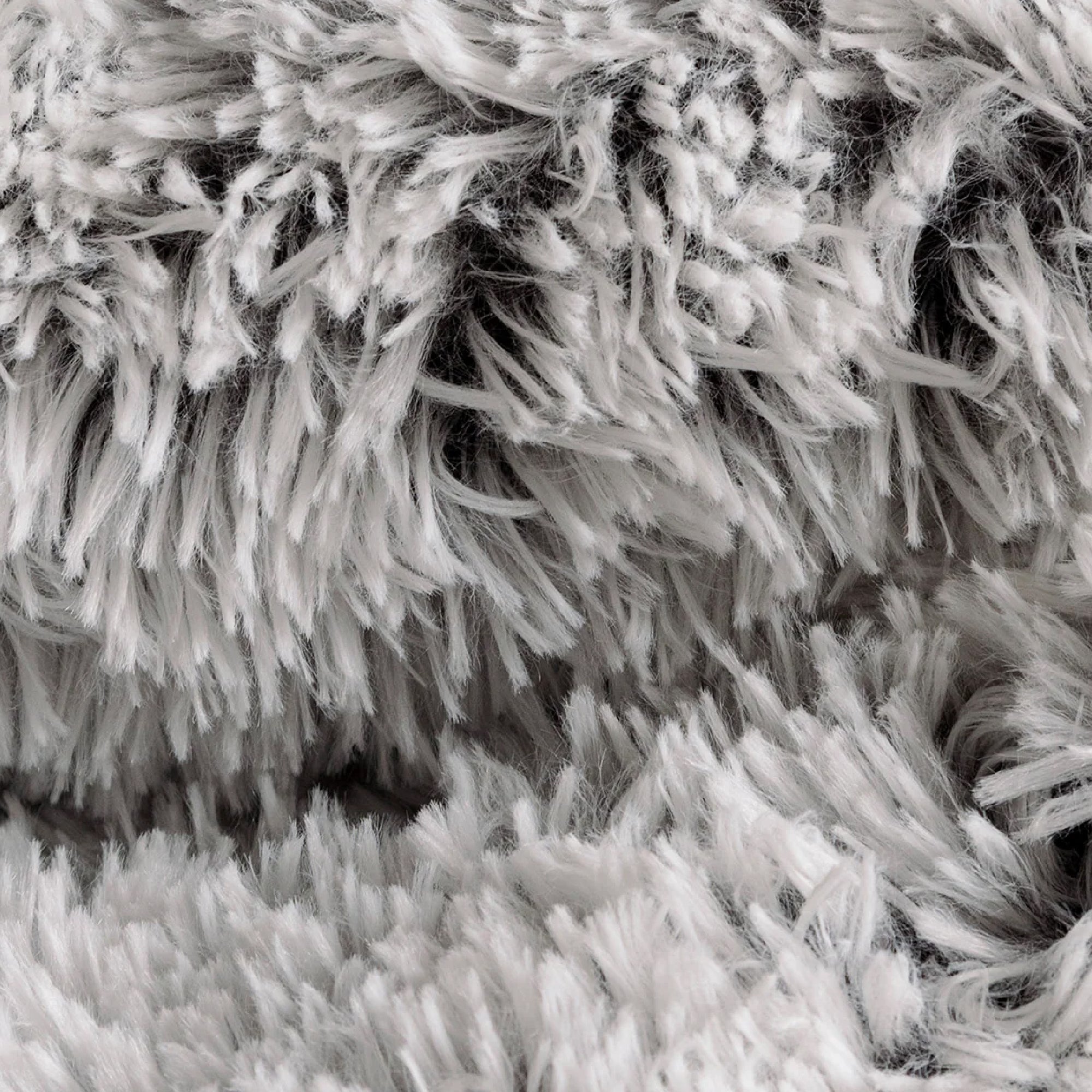 Cojín de textura en pelo largo de forma circular, su diseño es en colores gris con blanco con un toque de degradado.