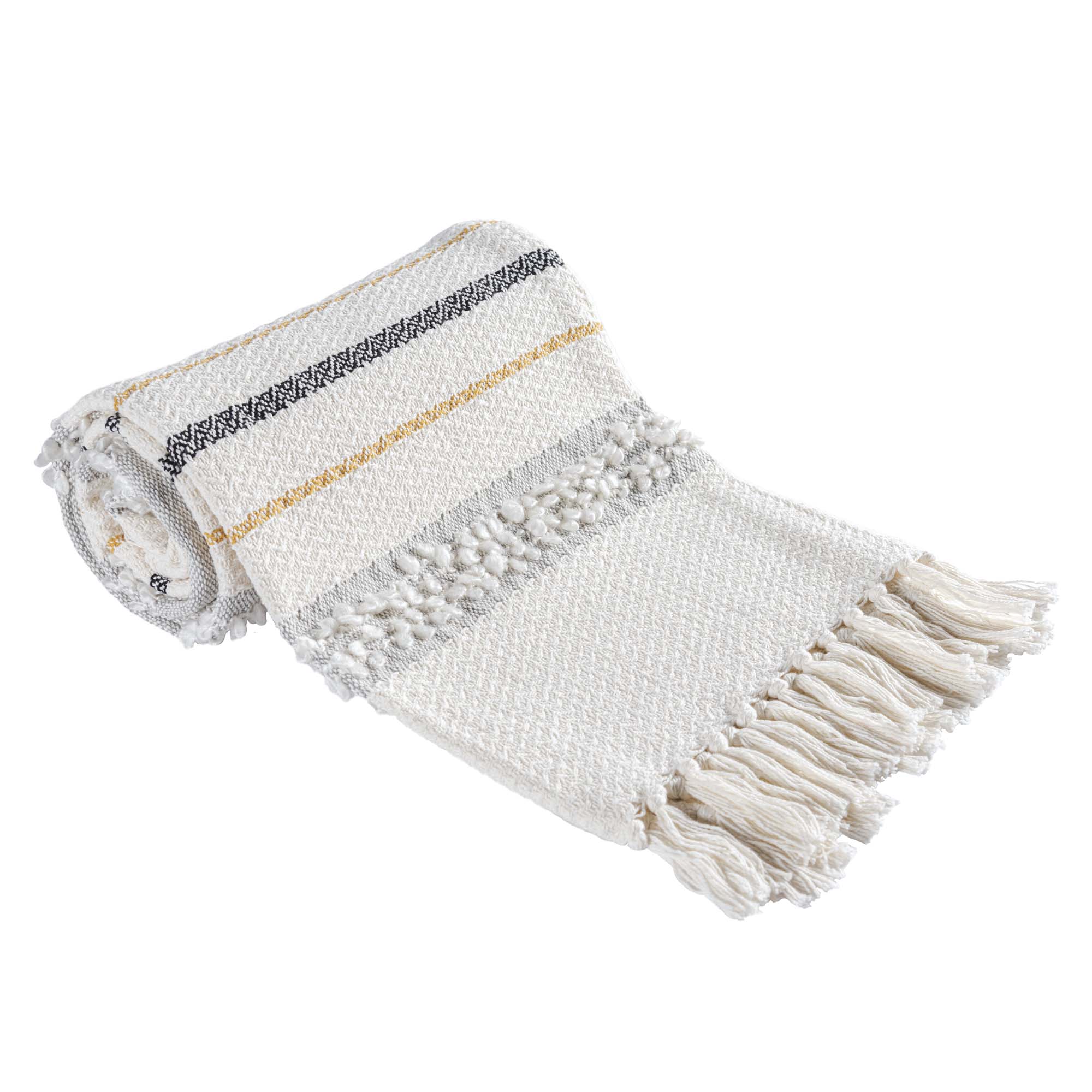 Una frazada única con un toque moderno, el complemento ideal para tu habitación en esta temporada. Su color es ideal para ser combinado fácilmente. Frazada tejida en color beige, con tonos en color gris y mostaza, te dejará decorar tu habitación de muchas maneras, es ligera y super calientita que podrás llevarla a cualquier parte.