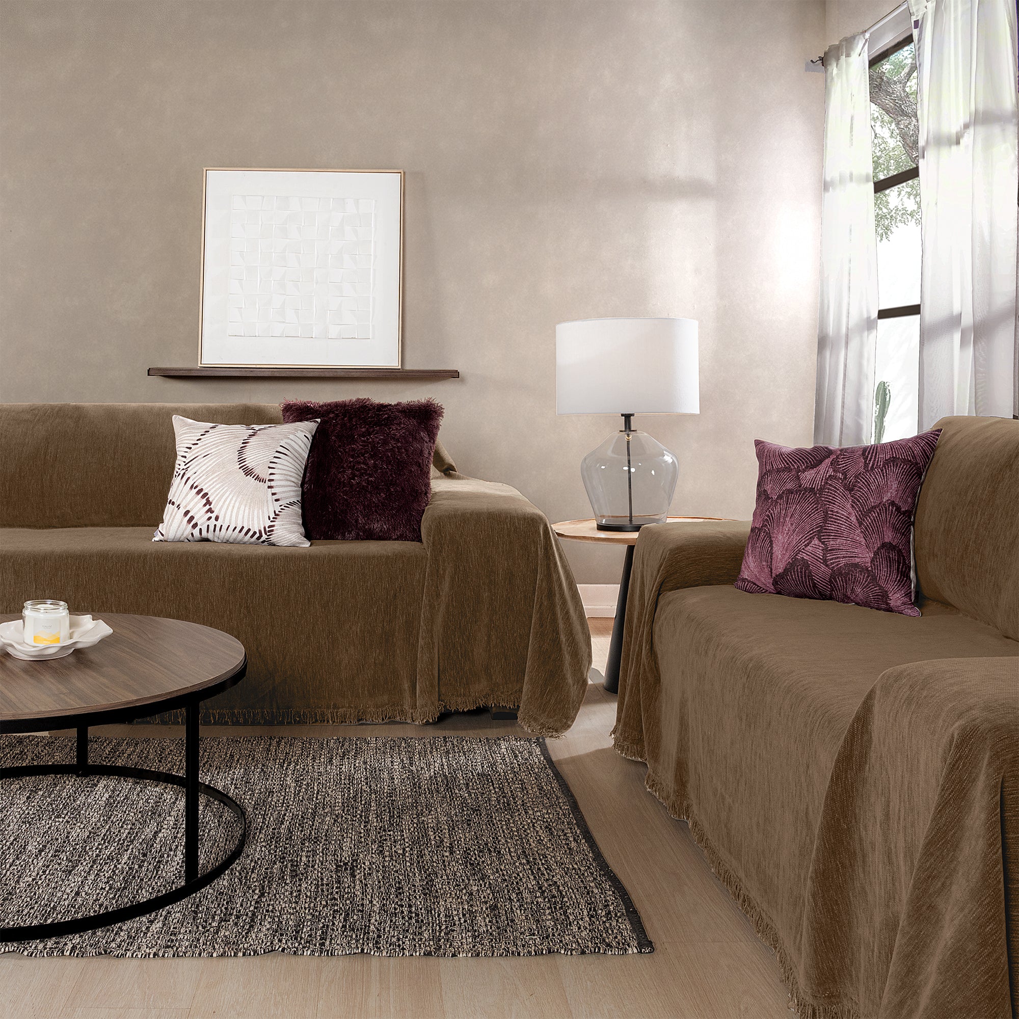 Renueva tu sala al instante con esta cubierta de suave textura chenille y elegantes flecos. Fácil de colocar y adaptable a cualquier sillón, solo extiéndela, ajusta las esquinas y alisa los pliegues para un look perfecto.